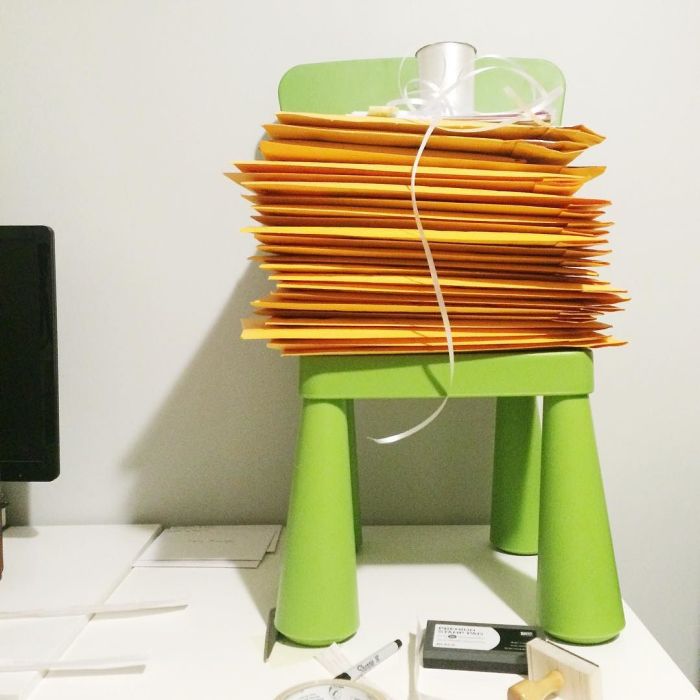 Ummm, can someone help me carry these to the post office? #frankthechair Share this: Share on X (Opens in new window) X Share on Facebook (Opens in new window) Facebook Share on Pinterest (Opens in new window) Pinterest Like Loading... Related